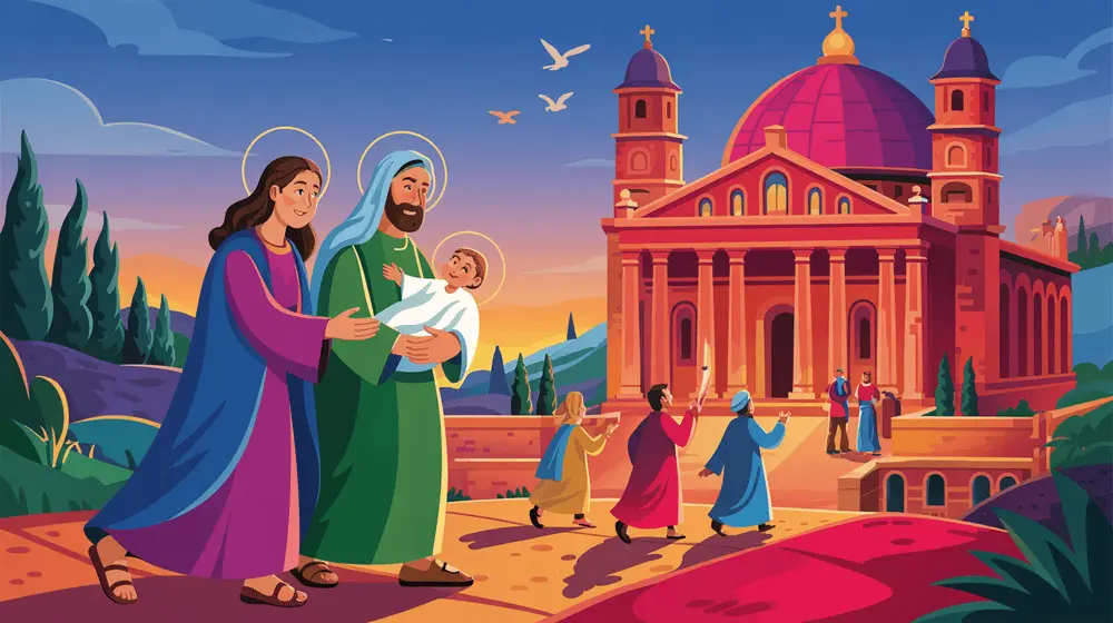 So, kids, Mary and Joseph took baby Jesus to the temple to say “Thanks, God!” Two old friends, Simeon and Anna, met him and got super happy. They told everyone Jesus was God’s gift. It was a big, joyful day!