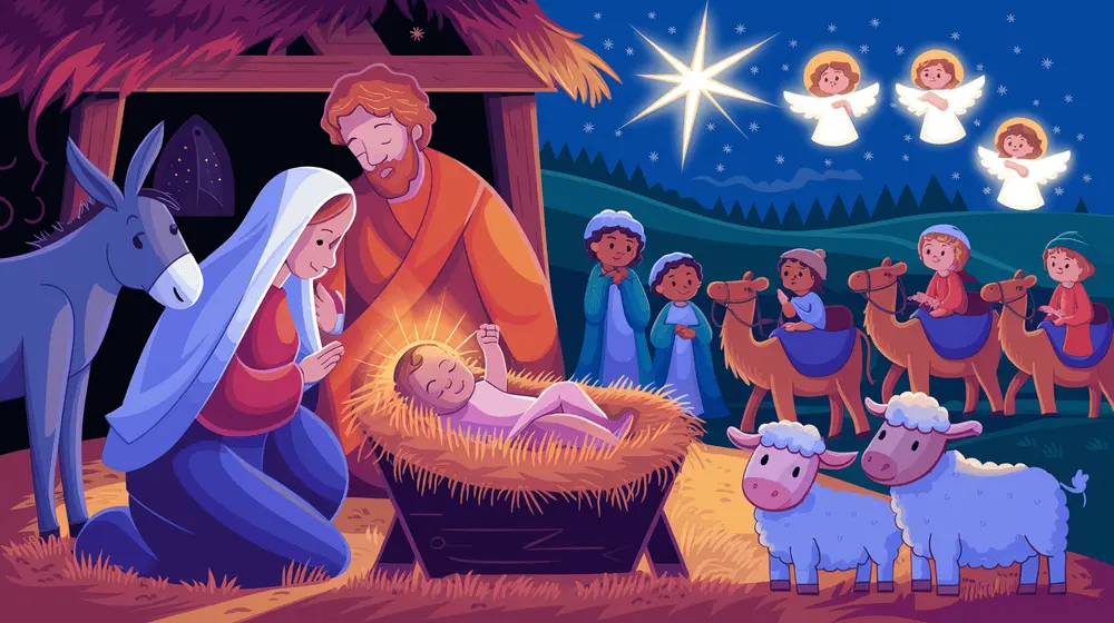 Hey, kids! This is the super cool story of how baby Jesus came into the world. It’s got a stable, a star, and lots of happy surprises. Let’s dive in!