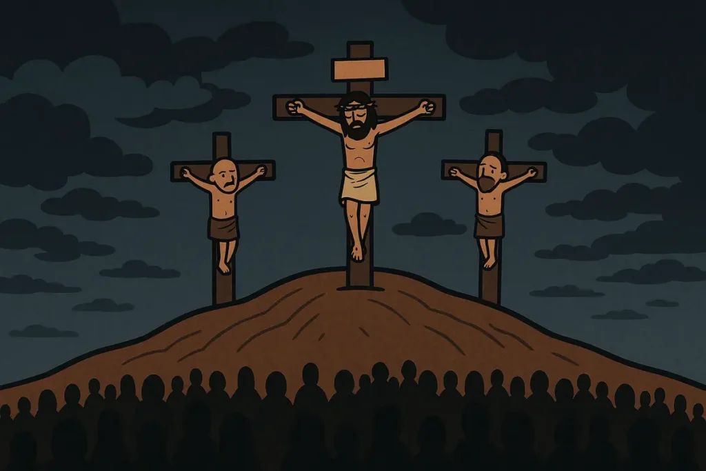 When they reached the hill, the soldiers nailed Jesus to the cross. They put two other men on crosses beside Him. The sky turned dark. People stood far away, watching quietly.